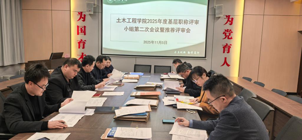 11月5日下午,土木工程学院在理工楼112会议室召开2025年度基层职称推荐评审会议。学院名誉院长鲍鹏、党总支书记徐远东、教学副院长杨子泉、班子成员及基层职称推荐小组成员方超、付善春、黄小林、韩冰参加了评审会议。与会人员共同对参与2025年职称评审人员材料进行了审核评审。人事处职称工作负责人盛士涛到会监督指导评审工作。