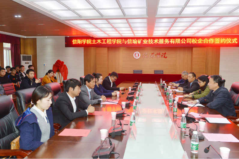 10月31日下午,我校土木工程学院与信瑜矿业技术服务有限公司校企合作签约揭牌仪式在人文楼208会议室举行。信阳市测绘地理信息局领导江元志、信瑜矿业技术服务有限公司总经理孙婷婷、业务部经理周浩、矿产项目负责人尹家林、办公室主任王子媚、太阳集团副校长王志华、教务处副处长邓荣娟、土木工程学院党总支书记兼副院长潘卫国、学院特聘专家教授雷绍民、王钢城、连星耀、徐伯荣及部分师生代表参加了签约仪式。仪式由土木工程学院院长主持。
