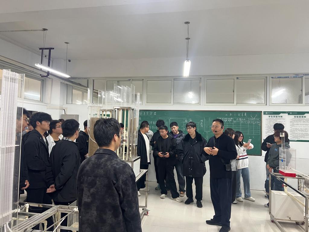 来到流体力学实验室,彭军老师围绕管道流态实验台、明渠水流实验系统等设备展开讲解。“流体力学是解决桥梁排水、建筑消防等工程问题的关键学科,我们实验室的设备能模拟不同水流状态,帮助大家理解水流运动规律。” 说明了流体力学在实际工程中的应用价值,让新生们对专业的实用性有了更深认知。