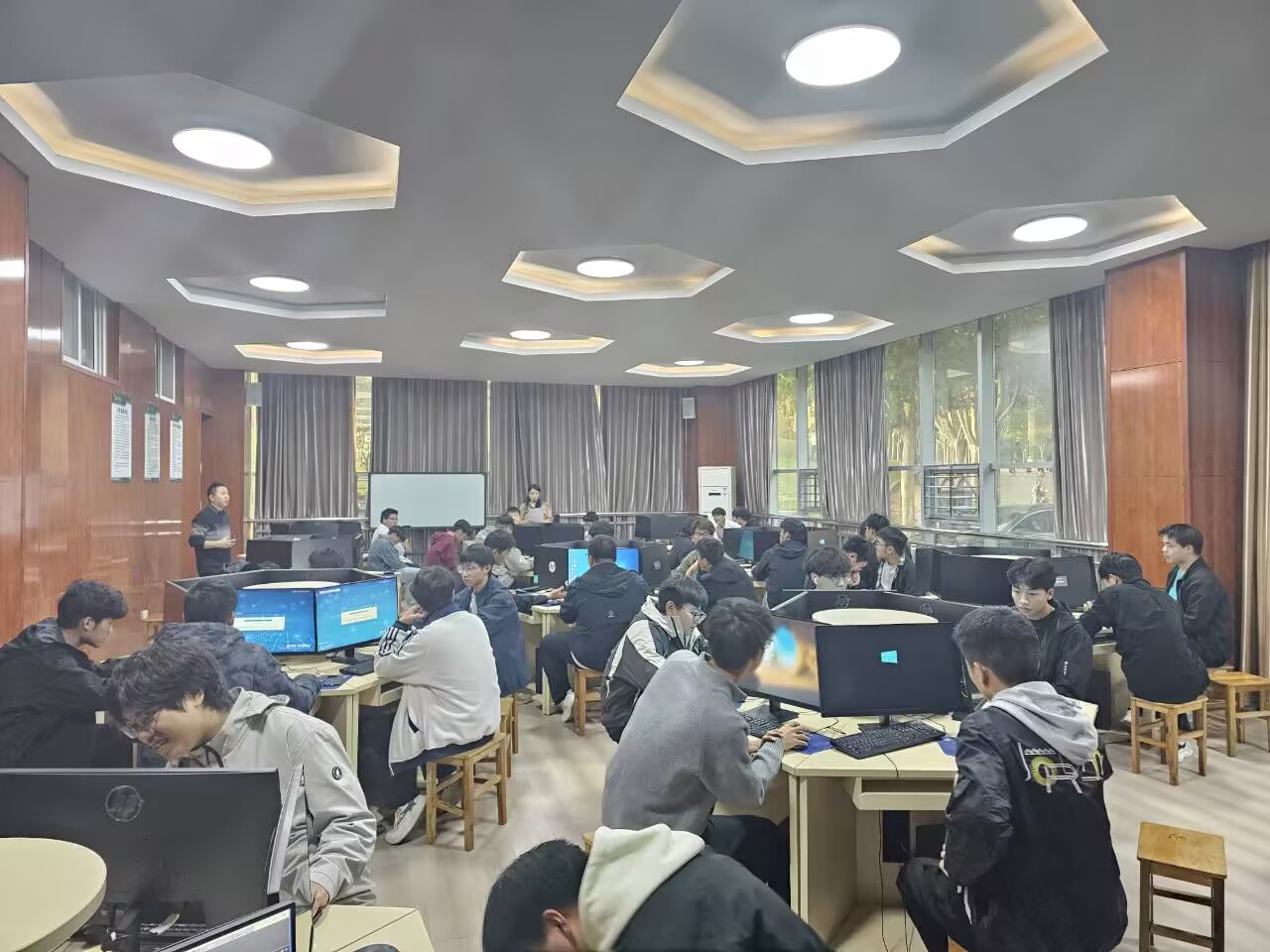 最后,新生们来到BIM 实训中心,负责人齐菲老师通过三维建模软件演示,直观呈现了 BIM 技术在建筑设计、施工模拟、运维管理等环节的应用。并介绍新生后续将通过实训课程掌握 BIM 基础操作,为适应行业发展趋势做好准备。
