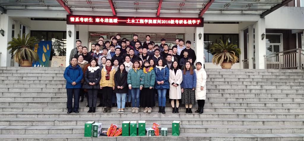 2020年研究生考试在即,备考气氛愈加浓烈,为鼓舞考研学子信心,缓解学生考前压力,12月9日下午,土木工程学院组织了为考研学子“情系考研生寒冬送温暖”的慰问活动。土木工程学院名誉院长、书记、学院秘书辅导员一起在理工楼前为备战考研的2016级学生“送温暖,添动力”。