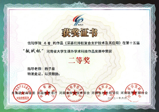 实验教学团队指导土木工程专业学生在全国大学生结构设计竞赛、河南省大学生结构设计竞赛中共取得国家级奖项3项,其中优秀组织奖1项,二等奖1项,三等奖1项;省级奖16项,其中优秀组织奖1项,最佳结构分析奖3项,最佳制作奖2项,特等奖1项,一等奖2项,二等奖2项,三等奖3项,优秀奖2项。